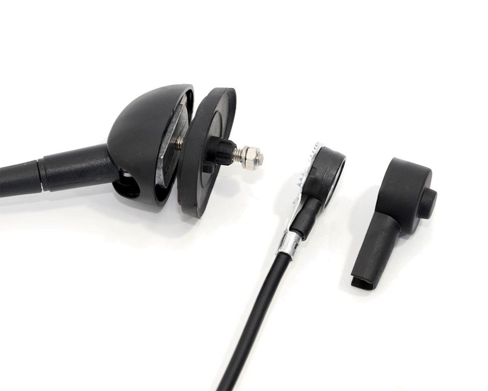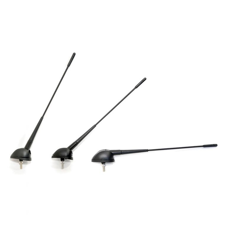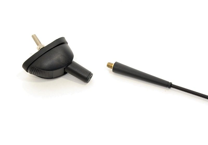 Střešní anténa určená pro příjem rozhlasového signálu v automobilu, složená ze šroubovacího prutu, upevňovací patice a přívodního kabelu.