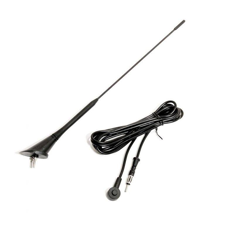 Prutová střešní laminátová anténa určená pro příjem rozhlasového signálu v automobilu, složená ze šroubovacího prutu, upevňovací patice a přívodního kabelu.