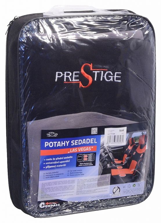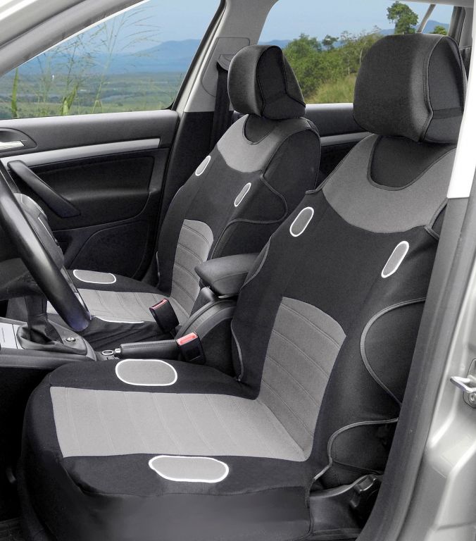 Potahy sedadel s univerzálním systémem upevnění, sada na přední sedadla (2x přední díl s opěrkami hlavy). Potah nelze použít u vozidel s bočním airbagem v opěradle autosedačky.