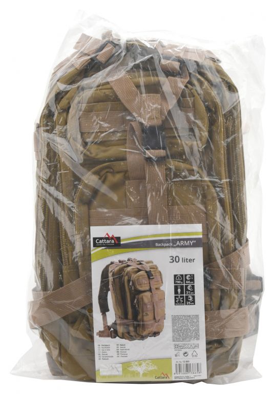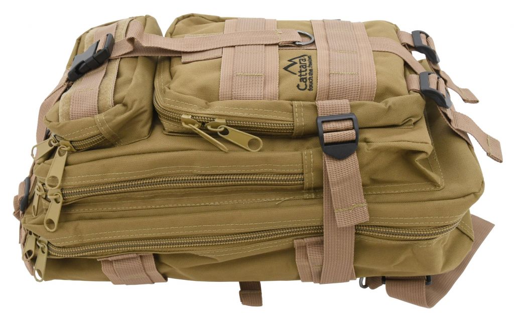 Praktický batoh vojenského vzhledu na tůry do přírody. Přední strana batohu obsahuje Molle systém - což je systém, který slouží pro uchycení dalších doplňků k výpravě. Každá kapsa je zajištěna bytelným dvoucestným zipem. Vnitřní kapsy a sítěná kapsa jsou doplněné o poutka pro bezpečné nošení drobných předmětů. Jedna z vnitřních kapes je opatřena klasickým zipem a zadní větraná kapsa je opatřena suchým zipem.