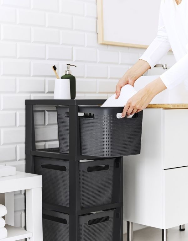 Tři úložné boxy s děrovanou strukturou, do kterých uložíte co potřebujete.
