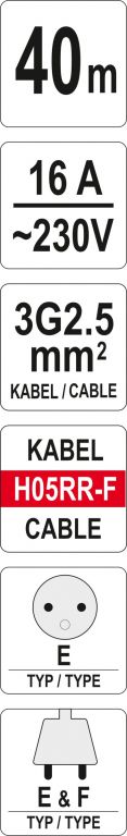 Kvalitně izolované měděné dráty pro připojení až 4 zařízení současně. Kabel H05RR-F odolává nejen mechanickému poškození, ale také chemickým látkám (oleje, benzín, ethyl-alkoholy, methyl, atd.) Zásuvka je opatřena pryžovou zátkou, která chrání prodlužovací kabel před nečistotami a vlhkostí.