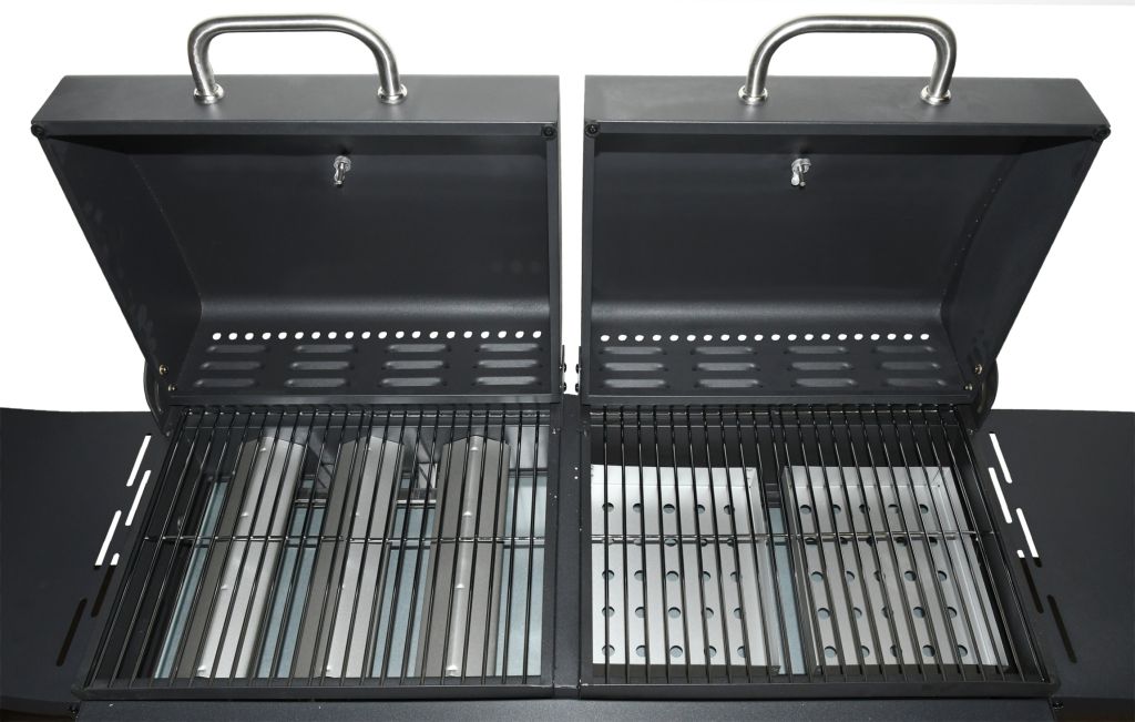 Kombinovaný gril s jedním prostorem pro grilování na plynu a jedním pro grilování na dřevěném uhlí. Je určen především pro zahrady a terasy.