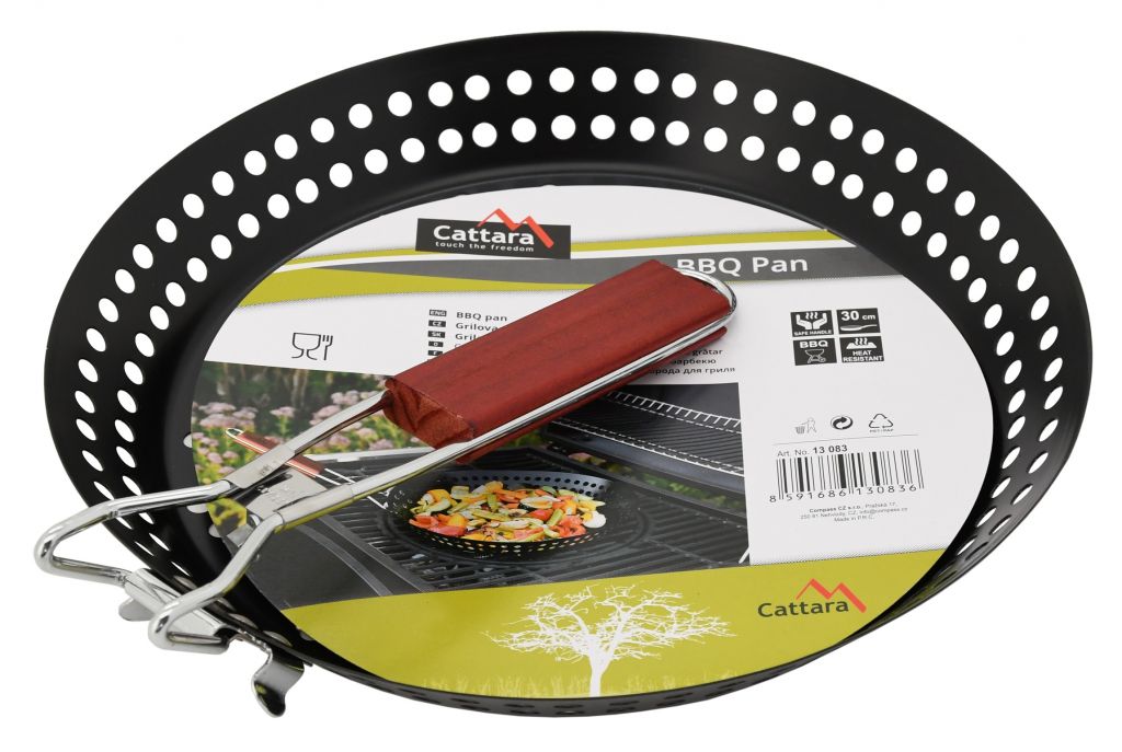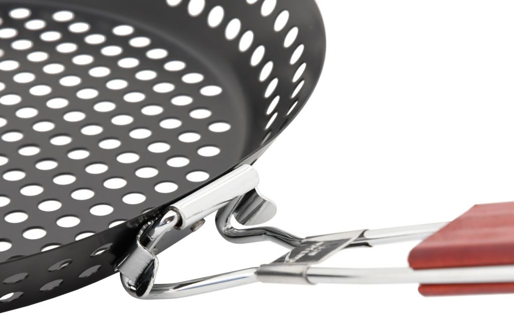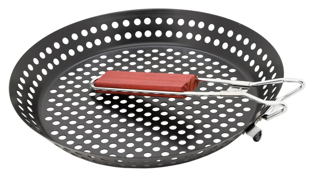 Děrovaná grilovací pánev se skládací rukojetí, pro grilování, do kempu a další outdoor využití.