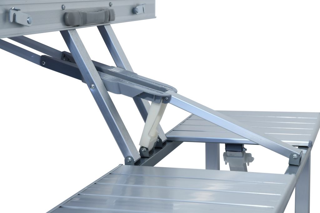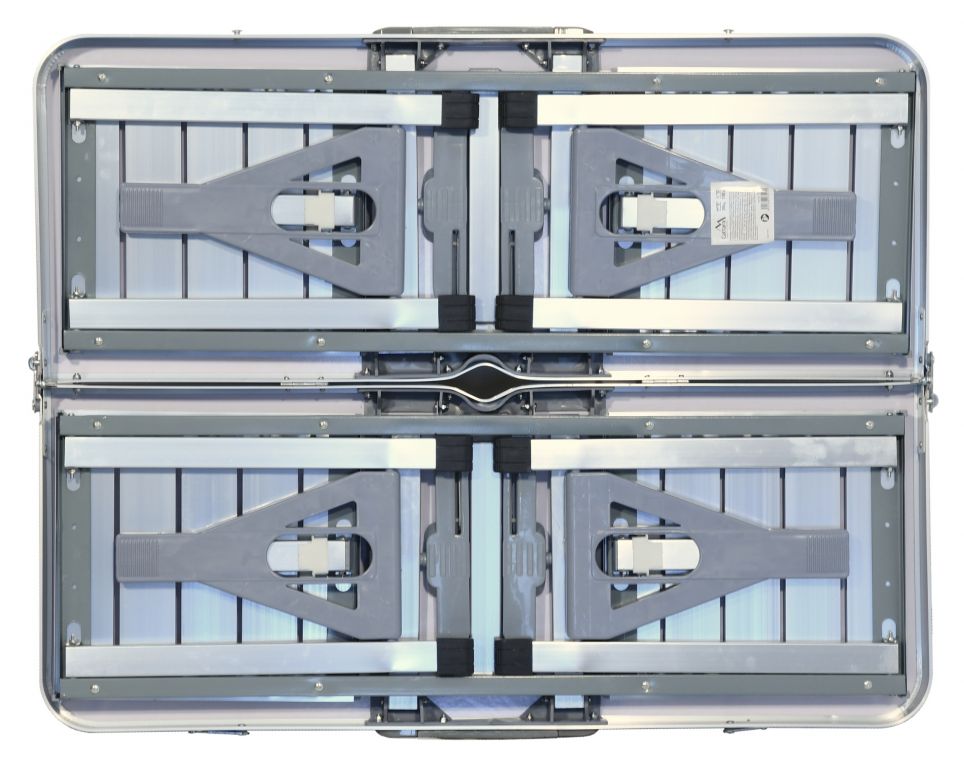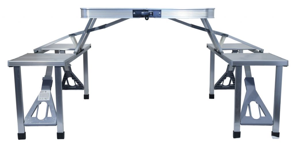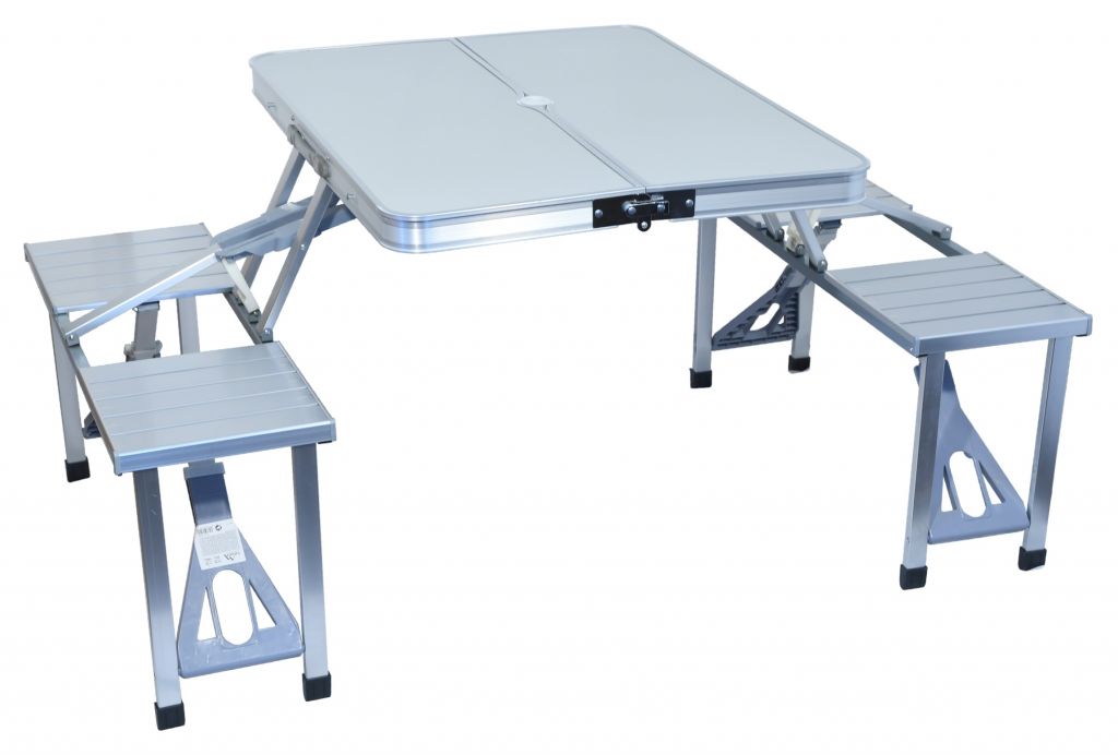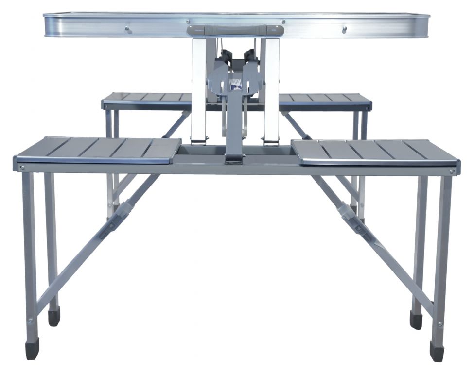 Sada je vybaven dvěma roztahovacími částmi, které po rozložení vytvoří stolek se 4 stoličkami. Jednotlivé rozkládací části jsou opatřeny jistícím mechnaismem, bránícím nechtěnnému složení. Zhotovení z hliníku a odolných plastových jistících částí nabízí stabilní posezení s nosností stolu 20 kg a nosností žídliček 100 kg. Umakartová deska stolu je opatřena středovým otvorem, který lze použít spolu se slunečníkem (není součástí). V přepravním stavu má sada příjemné rozměry 86 x 34 x 10 cm s hmotností 8,3 kg a je možné ji snadno přenášet, díky prakticky umístěnému zdvojenému madlu. Sada je tak vhodná především pro výlety do přírody, do kempu a pro další outdoor využití.