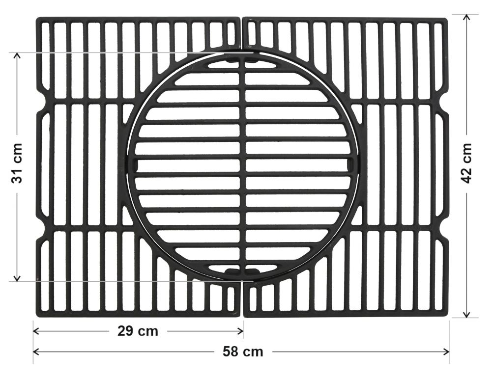 Litinový rošt s třídílnou konstrukcí s celkovými rozměry 58 x 42 cm se středovou částí o průměru 31 cm. Náhradní litinový rošt je vhodný přímo pro gril Cattara ROYAL 13040, ale i jiné grily odpovídajícíích rozměrů.