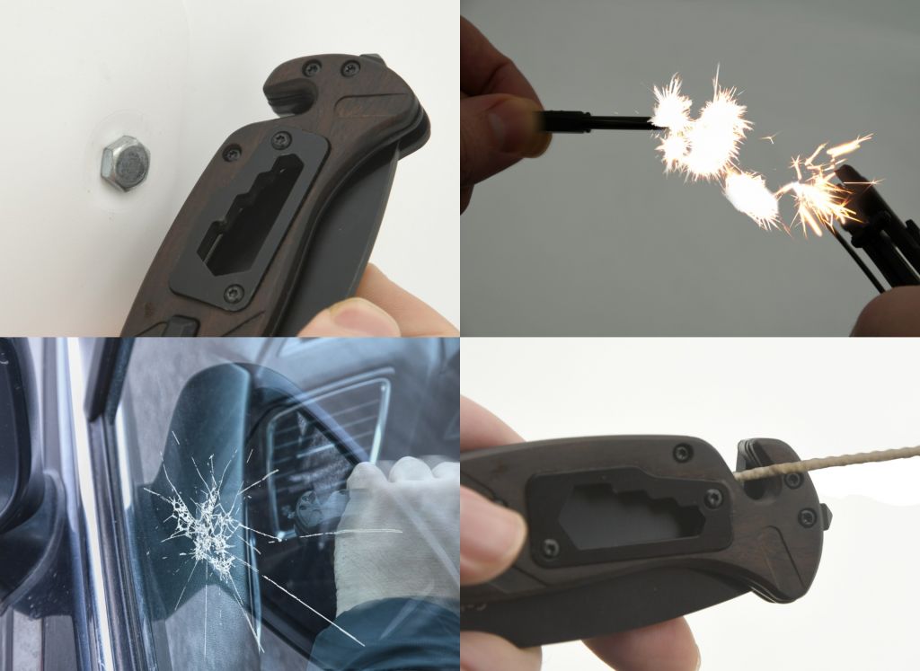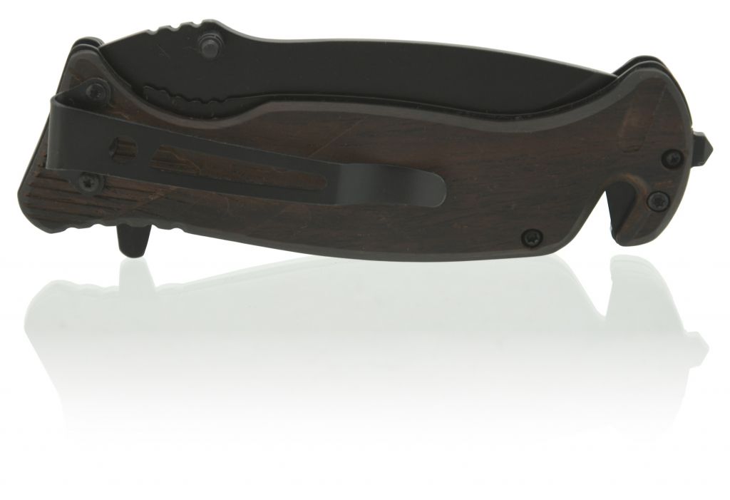 Čepel nože je zhotovena z nožířské oceli SS420, materiál dosahuje tvrdosti HRC50-52. Povrch čepele je opatřen černou barvou. Díky výstupkům na vrchní části čepele, případně výstupku na spodní straně je možné rychlé otevření nože jednou rukou. Nůž je vybaven pojistkou, která se ovládá bočním posuvem palce ve spodní části rukojeti. Střenky rukojeti dokonale imitují dřevo a jsou pohodlné na úchop. Nůž je opatřen dalším příslušenstvím pro různé použití. Součástí je na přední straně nože klíč na matice 6/8/10/12 mm, v zadní části je opatřen škrtátkem, které společně s vroubkovanou horní částí čepele využijete jako křesadlo, nebo píšťalku.