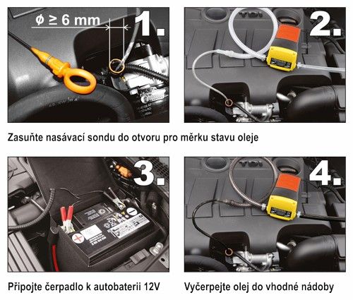 Napájení pomocí svorek, ideální k připojení na autobaterii 12 V. Vhodné pro jednoduchou výměnu motorového oleje. Není nutné hledat vypouštěcí šroub oleje, stačí jen zasunout nasávací sondu do otvoru pro měrku stavu oleje (až do vnitřního průměru 6 mm) a olej vysát do připravené nádoby.