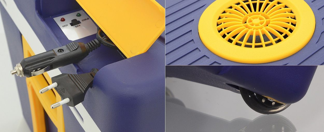 Přenosný chladicí box s možností ohřevu, napájení ze zásuvky autozapalovače 12 V, nebo z běžné zásuvky 230 V. Jedná se o chladicí box na termoelektrické bázi s ventilátorovým systémem chlazení, neobsahujícím žádné freony. Systém je navíc vybaven i režimem ohřevu, kdy je možné udržovat uvnitř boxu teplotu 50 – 65 °C. Chladicí box je velmi snadno přenosný, je také vybaven kolečky a prodlouženou rukojetí pro snadné převážení. Napájecí kabely jsou uloženy v praktické uzavíratelné schránce přímo ve víku, takže jsou vždy při ruce a přesto nikdy nepřekáží.