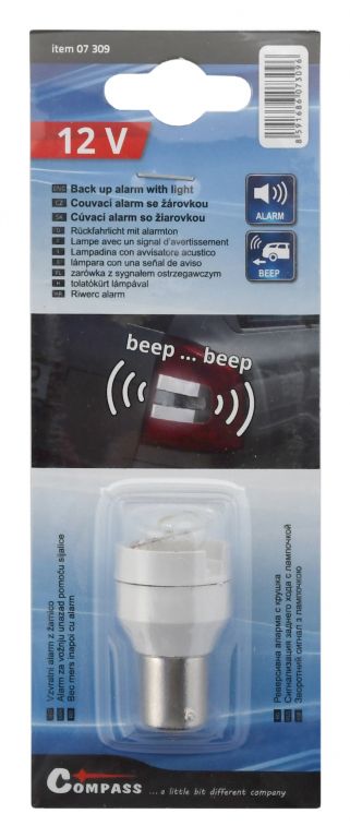 Při couvání vozidla vydává varovný zvukový signál. Univerzální pro automobily s napájecím napětím 12V a žárovkou zpětného světla s paticí BA15s. Couvací alarm je osazen žárovkou 12V (celosklo).