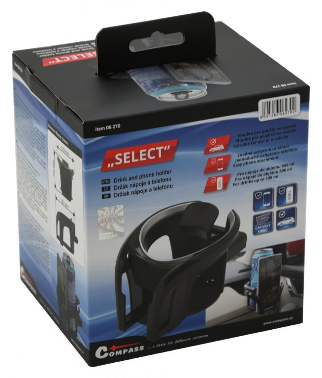 Držák je vhodný pro umístění telefonu a nápoje současně. Telefon lze jednoduše do držáku vložit jednou rukou a i přesto je zabezpečen před nechtěným pohybem pomocí pružinového systému. Nápoje jsou rovněž zajištěny před volným pohybem a vylitím. K držáku je pro úspěšnou a snadnou instalaci přiložena sada nastavitelých adaptérů do mřížky ventilace, sada k přímému uchycení za mřížku ventilace a podpěra se samolepící vrstvou. Konstrukce zabezpečuje vysokou stabilitu a díky použití podpěry rovnoměrně rozděluje zatížení a brání tak poškození mřížky ventilace.