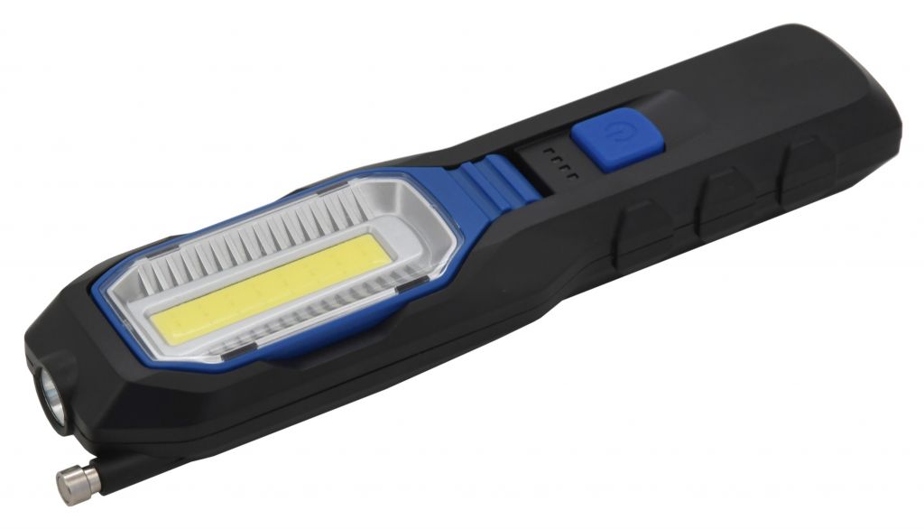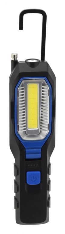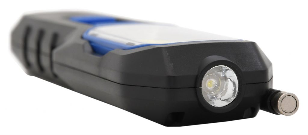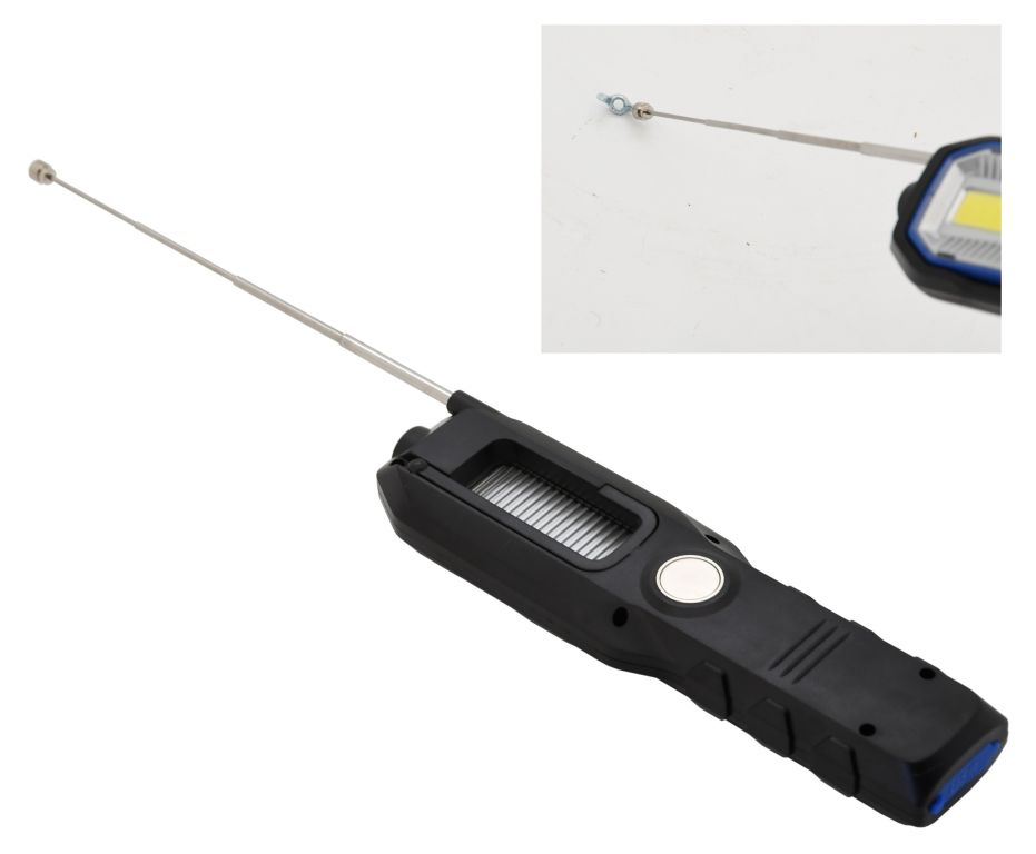 Dobíjecí montážní led lampa nabízí čelní bodové osvětlení, boční rozptýlené COB osvětlení se dvěmi intenzitami, doplněné červeným SOS signálním osvětlením. COB panel lze vyklopit dle potřeby. Konstrukce je opatřena magnetem na zadní straně pro připavnění na kovové povrchy, háčkem pro snadné zavěšení a je odolná proti stříkající vodě. Dále je zařízení opatřeno teleskopickým vytahovákem s magnetickým zakončením na drobné kovové předměty. Lampa je vybavena vestavěnou dobíjecí Li-Ion baterií s kapacitou 1800 mAh. Nabíjení je řešeno USB kabelem. Přístroj je navíc díky výstupnímu USB konektoru možné použít jako powerbanku.