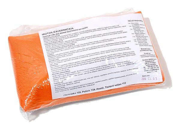 Lékárnička pro motocykly, obsah odpovídá vyhlášce č. 206/2018 sb. Ministerstva dopravy. Provedení textilní brašna. Lékárnička je součástí povinné výbavy motocyklů a skútrů.
