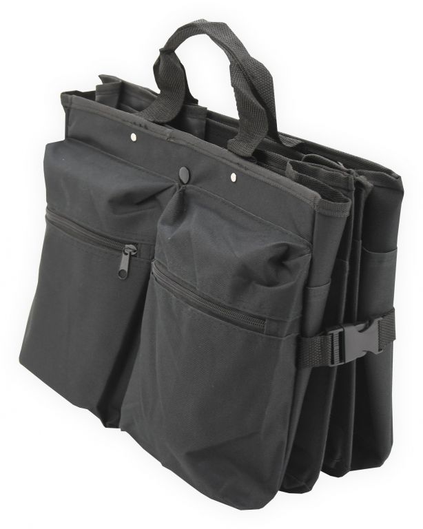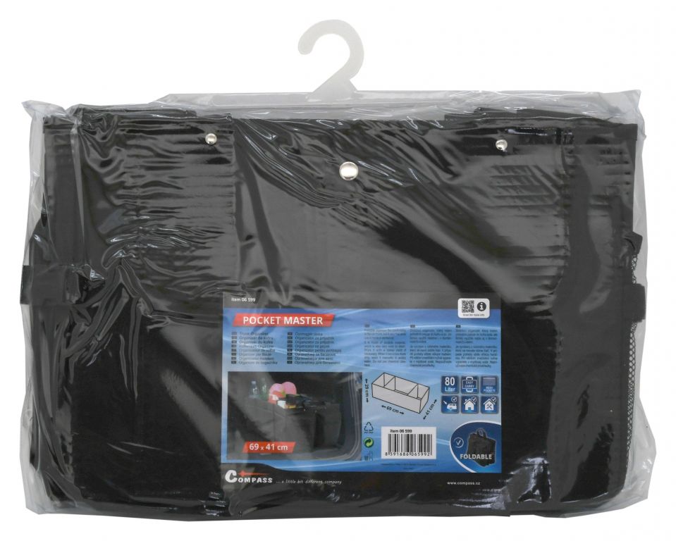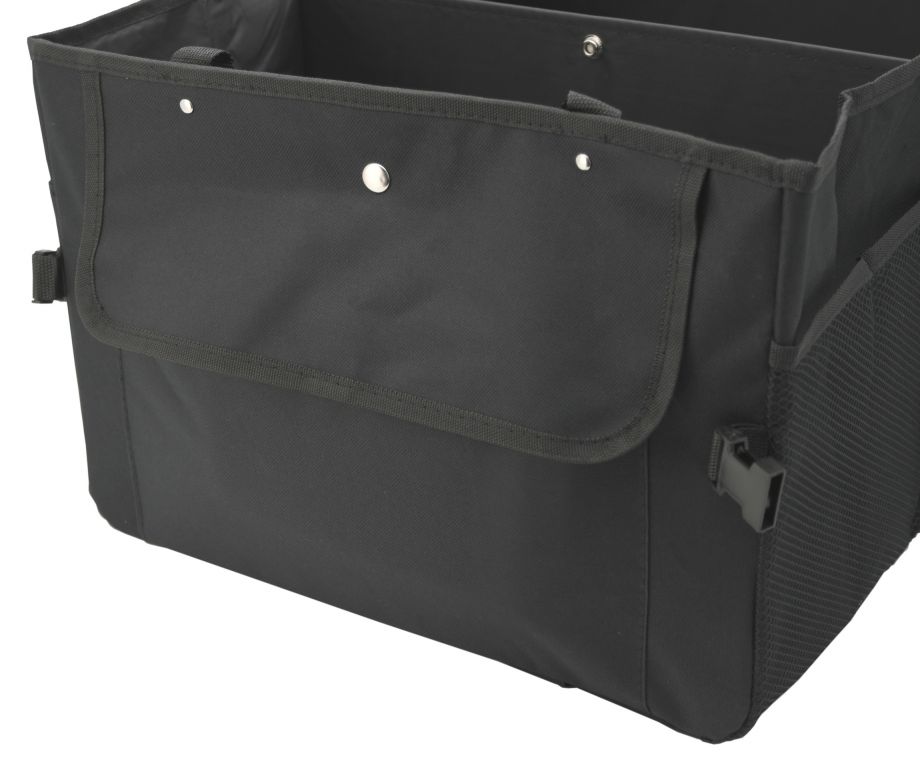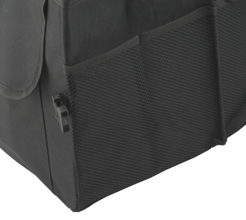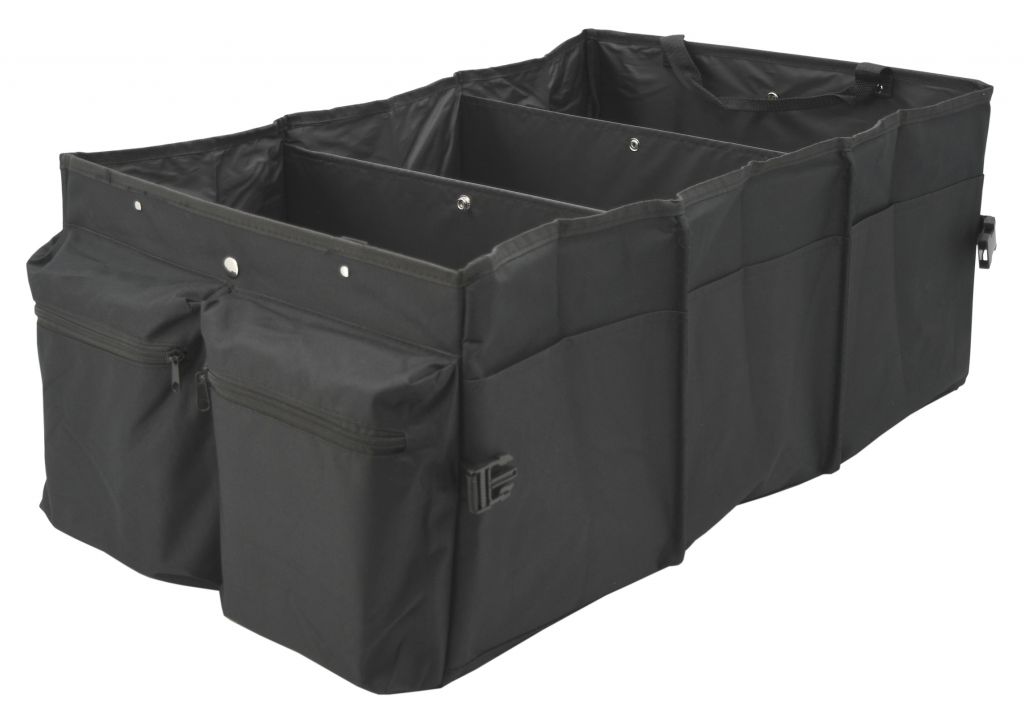 Skládací, třídílný organizér do kufru automobilu o objemu 80 L. Organizér s rozměry 69 x 29 x 41 cm je zhotoven z kvalitně obšitého 100% polyesteru. Čelní strana je opatřena dvěma objemnými kapsami, zadní strana objemnou kapsou na suchý zip. Na jedné straně je organizér doplněn o sítěnou kapsu a na straně druhé dalšími kapsami. Po naplnění organizéru je možná manipulace díky našitým madlům. Spodní část je opatřena dvěma našitými suchými zipy, jež zabezpečují organizér na daném místě, bez nechtěnného pohybu. Pro složení je možné pomocí cvočků secvaknout a zmenšit tak rozměr organizéru, pokud jej zrovna nepoužíváte.