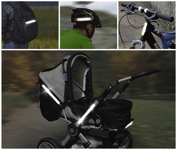 Výstražný reflexní doplněk, ideální k nalepení na kočárek, kolo, dětskou tříkolku, školní brašnu, na helmu či jiný předmět. Zejména za snížené viditelnosti či v šeru několikanásobně prodlužuje vzdálenost, na kterou je člověk viditelný. Z pásky lze jednoduše vytvořit i více reflexních pruhů, stačí jen pásku nastříhat na jednotlivé kousky.