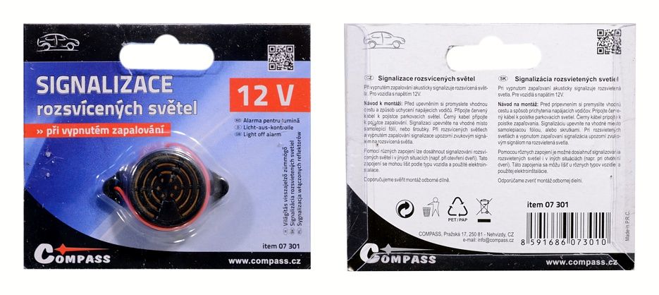 Při vypnutí zapalování, nebo při otevření dveří automobilu akusticky signalizuje nevypnutá světla vozidla. Ideální ochrana proti nechtěnému vybití Vašeho akumulátoru. Nejdříve se připojí kabely k pojistkám, poté se hlavní část připevnění přilepením, nebo přišroubováním - doporučujeme však svěřit montáž odporné dílně.