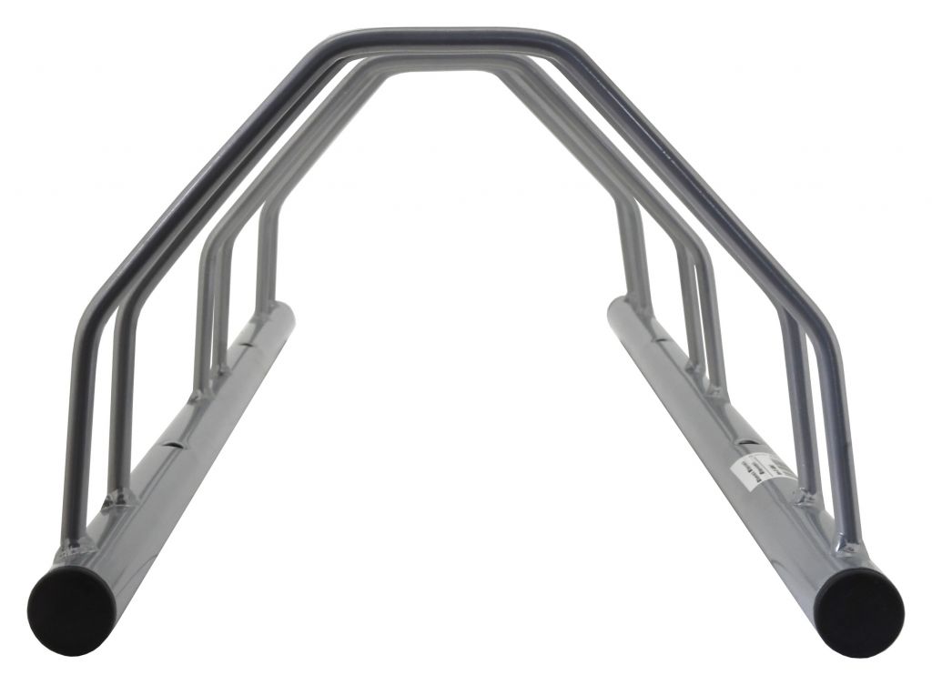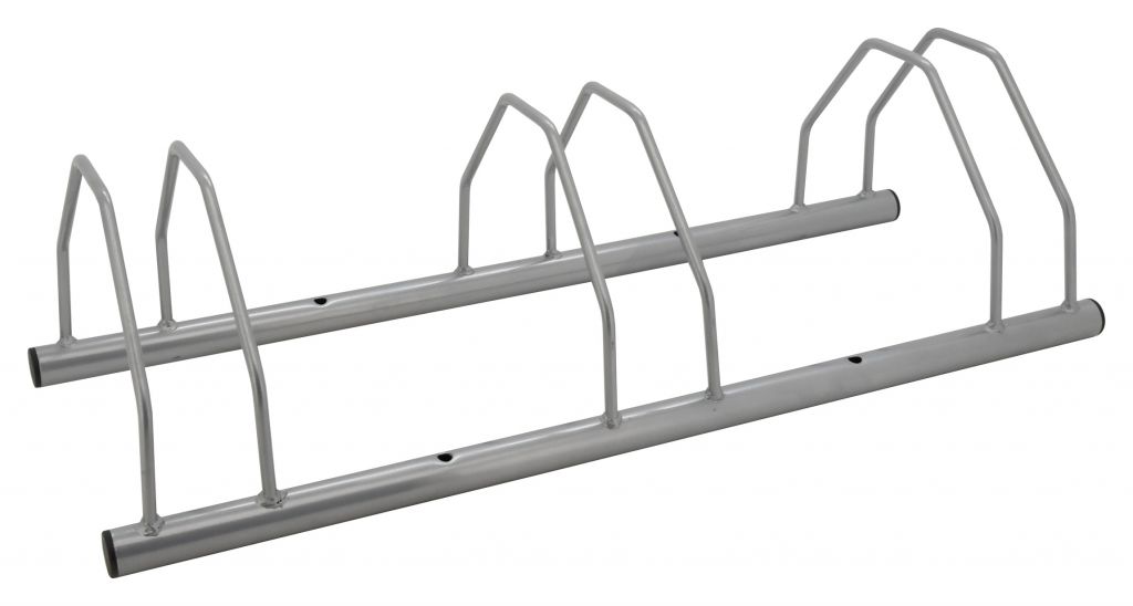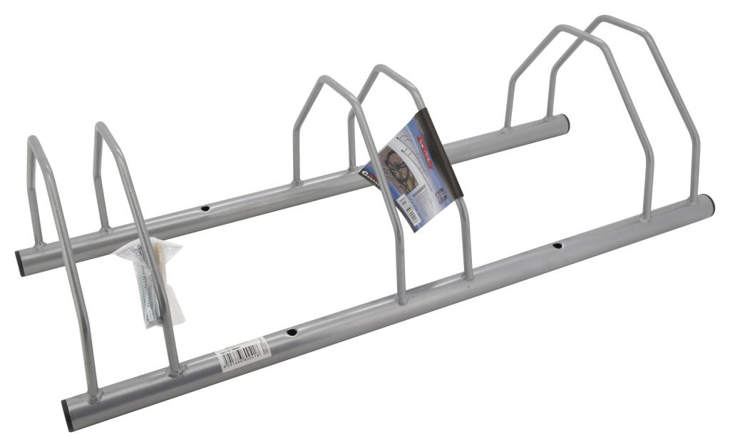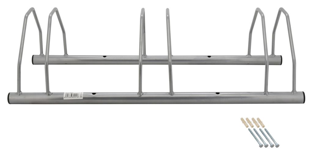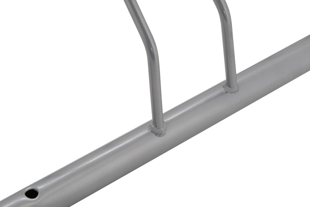 Praktický stojan pro 3 jízdní kola. Můžete ho využít u sebe před domem, u restaurace či obchodu. Celokovová konstrukce s šedostříbrným povrchem je opatřena drátem o průměru 9 mm (vrchní část) a trubkami 30 mm (základnová část), zajišťuje tak bezpečné umístění kol. Stojan je vhodné připevnit do země pomocí vrutů s hmoždinkami (jsou součástí).