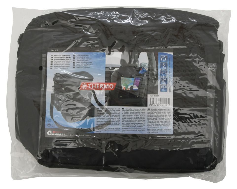 Termotaška k zavěšení na opěrku hlavy u přední sedačky automobilu, vhodná i k přenášení pomocí ramenního popruhu. Taška je vybavena thermo vložkou a kvalitním zipovým uzávěrem, je tak vhodná k použití na nákupy, piknik nebo na výlety - potraviny uložené v termotašce zůstávají vychlazené. Taška má rozměry 29,5 x 23 x 10 cm, je opatřena snadno omyvatelným vnitřním prostorem a několika doplňujícími kapsami pro nejrůznější drobnosti. Popruhy jsou délkově nastavitelné, popruh k přenášení je navíc odepínatelný.