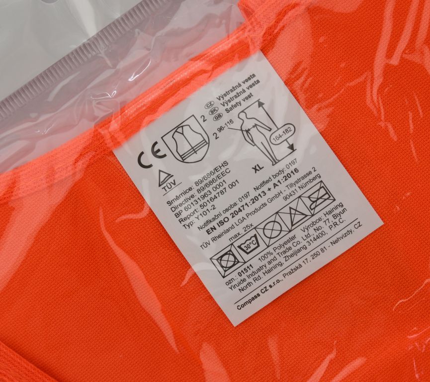 Výstražná reflexní vesta se zapínáním na suchý zip a dvěma reflexnímy pruhy po celém obvodu. Vesta se obleče na stávající oděv tak, aby žádná její část nebyla překryta jinými částmi oděvu a na přední straně se zapne pomocí suchého zipu.