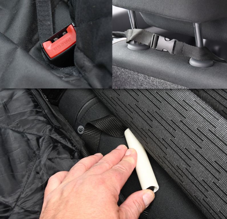 Prošívaný, vícevrstvý materiál zajišťuje pohodlné cestování psa. Deka ochrání i zadní stranu předních sedadel, a navíc i boční strany sedadel, díky uším na bocích. Deka je opatřena otvory pro bezpečnostní pásy, uzavíratelné na suchý zip. Upevnění je řešeno za opěrky hlavy s fixací mezi sedadly.