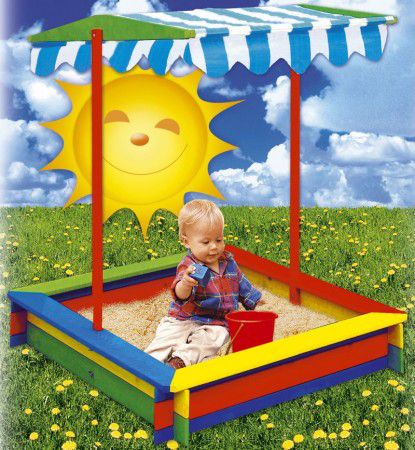 Pěkné barevné pískoviště se stříškou a certifikátem FSC. Střecha je z nepromokavého materiálu a zároveň slouží jako stínítko před sluncem.