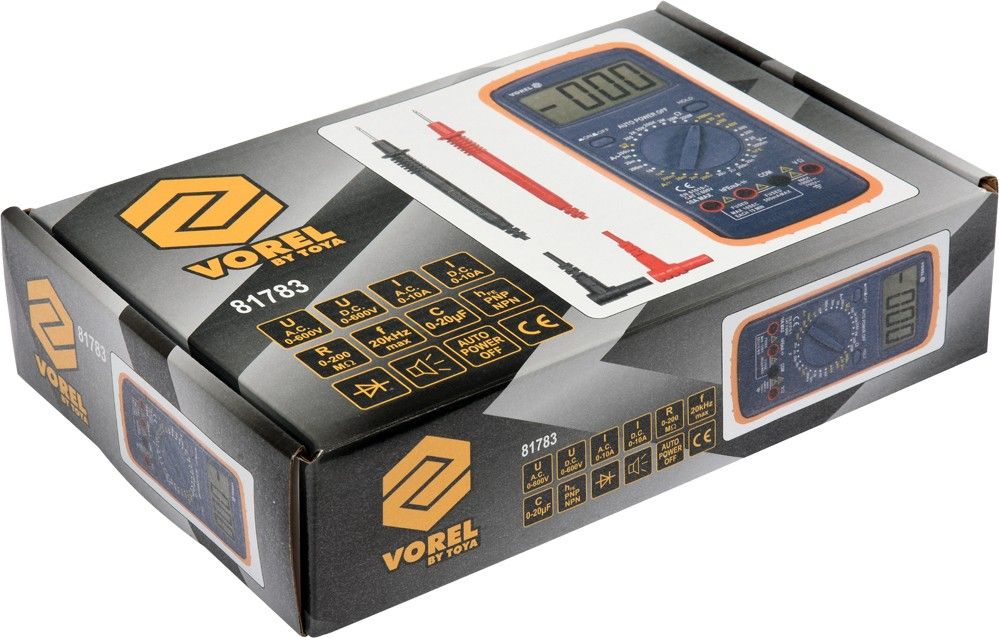 Tento měřák umožňuje měření střídavého a stejnosměrného napětí, proudu i odporu, kapacity, frekvence a teploty. Navíc je tento multimetr vybaven testovacím slotem pro kontrolu tranzistorů a zároveň umí testovat i diody. Mezi jednotlivými typy měření se přepíná pomocí otočného voliče, kde lze rovněž nastavit požadovaný rozsah u jednotlivých veličin. Naměřené hodnoty se zobrazují na přehledném LCD displeji odolného, plastového těla přístroje. Tělo je navíc umístěno v sundavacím silikonovém obalu, který zajišťuje částečnou ochranu před vlhkostí, nečistotmi a v neposlední řadě chrání přístroj před vibracemi. K měřiči jsou přiloženy kvalitní kabely s měřícími hroty.