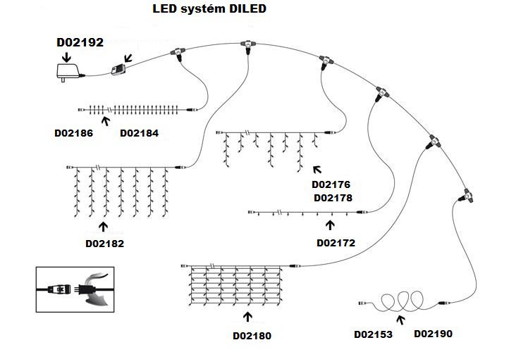 Systém vánočního osvětlení diLED je jedinečný, díky nepřeberným možnostem napojení a rozšíření řetězů. Můžete si vybrat z celé nabídky a řetězy na sebe vzájemně napojovat a díky ovladači přidávat i světelné funkce. Systém diLED se již kvalitou blížíprofesionálnímů osvětlení. Průměrná životnost LED žárovek je přibližně 50 000 hodin svícení. Světelná síť je vhodná jak pro venkovní, tak i pro vnitřní použití. Na jeden napájecí adaptér můžete napojit až 2 000 diod v rámci diLED systému.