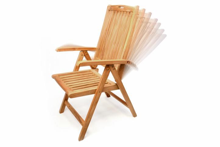 Sada dvou skládacích židlí z týkového dřeva s vysokým opěradlem, které je možné nastavit do pěti pol
