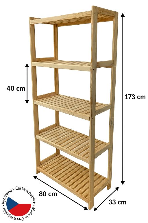 Dřevěný regál z borovice 5 polic 173x80x33 cm, česká výroba