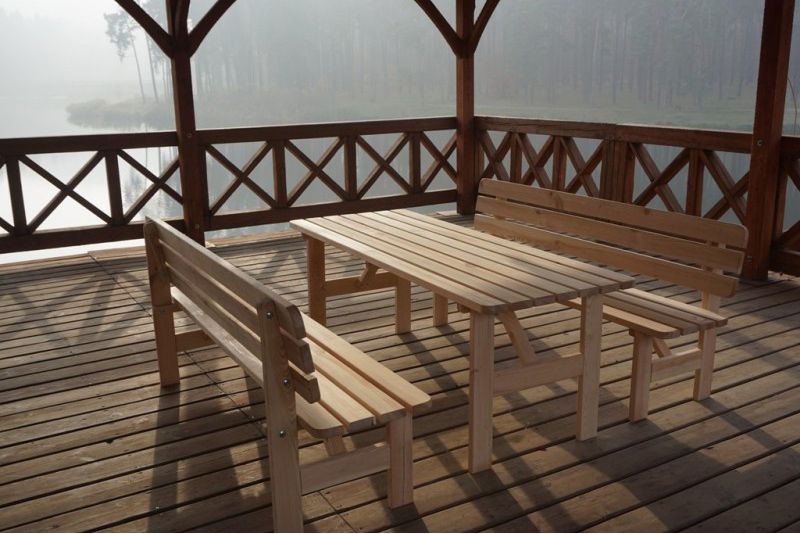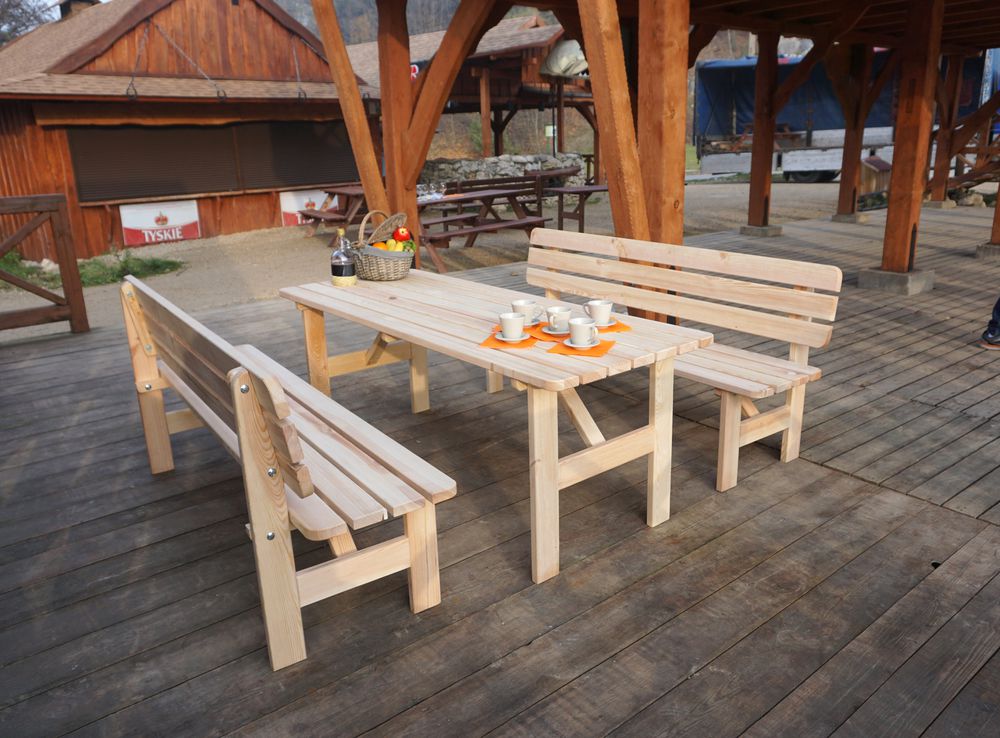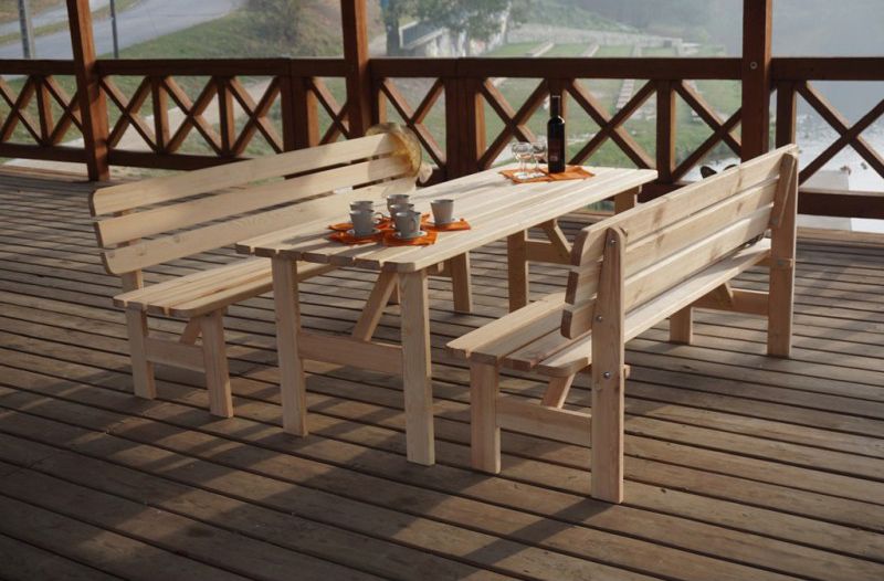 Zahradní, masivní stůl vyrobený z borovicového dřeva v přírodní barvě.