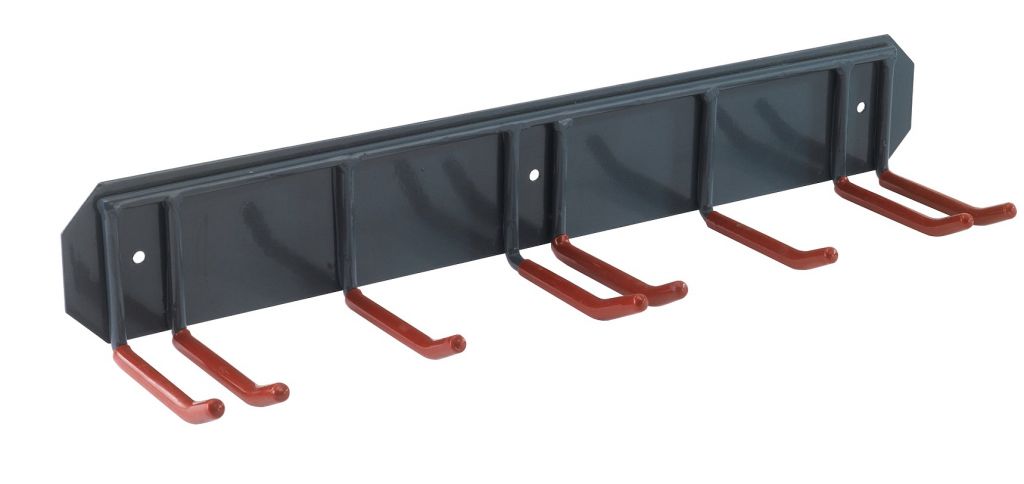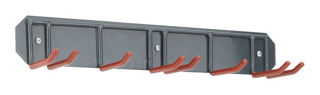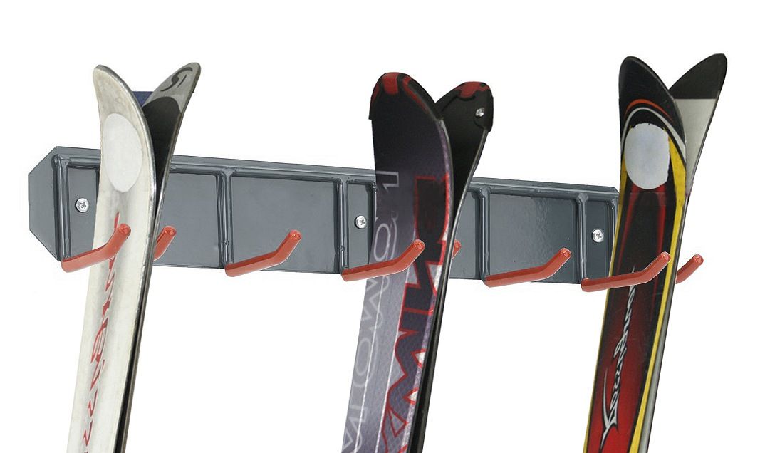 Praktický držák lyží a hůlek s uchycením do stěny. Držák je celokovový a je tvořen pevnou základnou a sestavou háků.