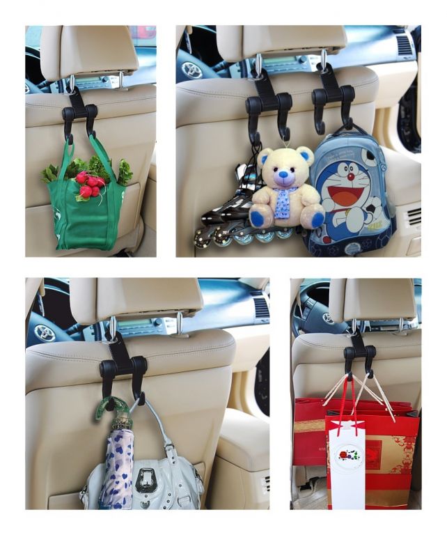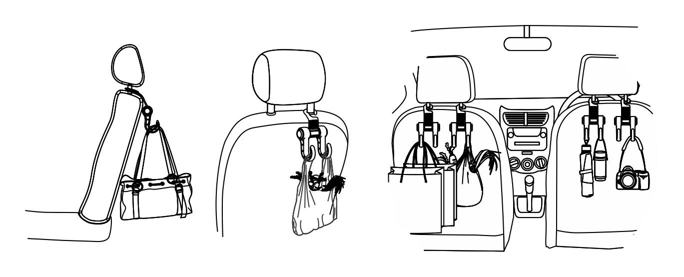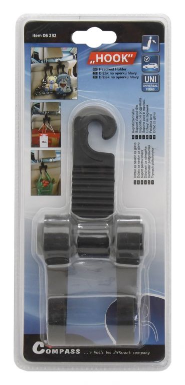Praktický držák k zavěšení na opěrku hlavy předních sedadel automobilu. Je vybaven dvěma háky, na které lze zavěsit např. nákupní tašku, oděvy, batoh atp. Má robustní konstrukci těla.