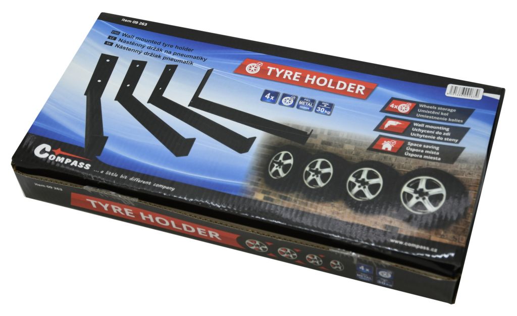 Ocelové držáky mají nosnost 30kg (jeden držák) a jsou uzpůsobeny pro umístění disků s pneumatikou. Disk se na držák umísťuje za středový otvor. Pro zamezení poškrábání disků jsou součástí balení samolepící pěnové chrániče.