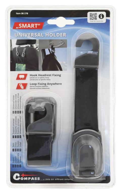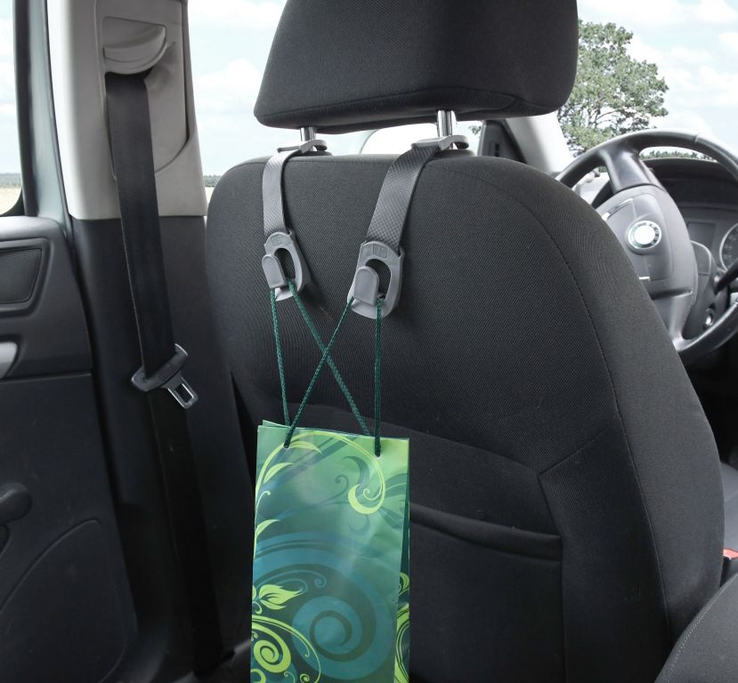 Praktický držák k zavěšení na opěrku hlavy, nebo zavěšení na jiných místech při upnutí do smyčky.