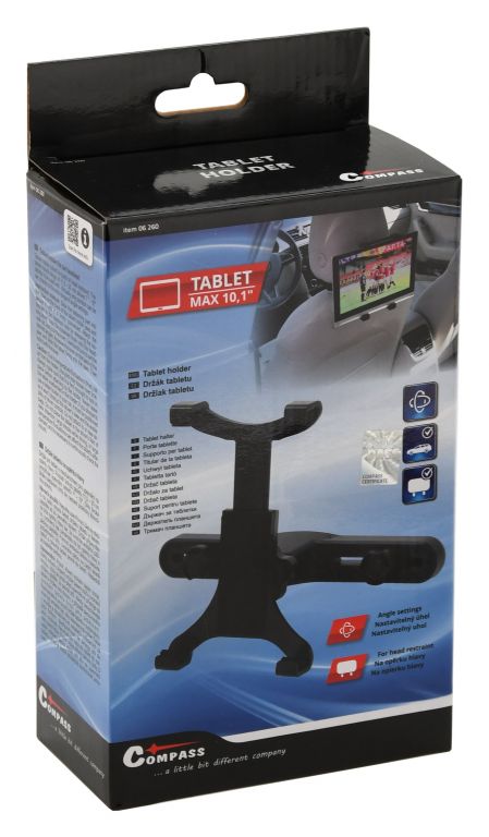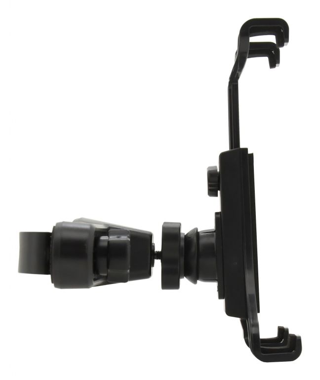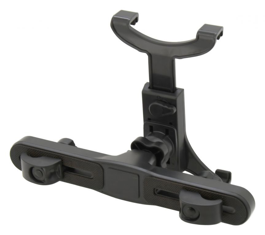 Držák pro tablet s mechanizmem pro upevnění na opěrku hlavy. Díky široké škále nastavení úhlů zle nastavit prakticky libovolnou polohu.