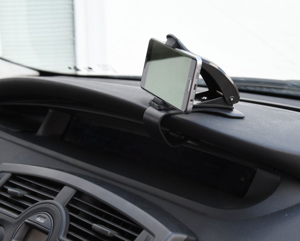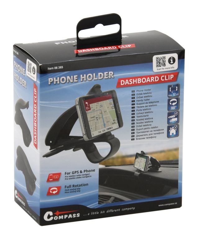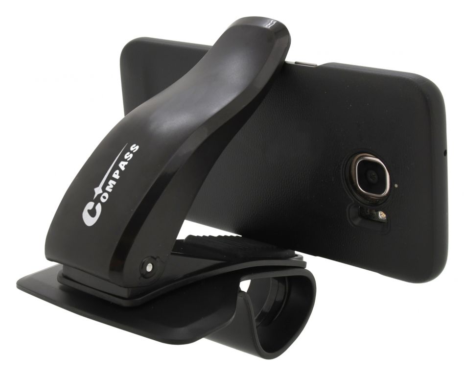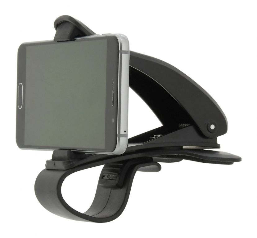 Držák telefonu nebo navigace s klipem, který umožňuje upevnění na vhodnou hranu. Vhodný do každého automobilu.