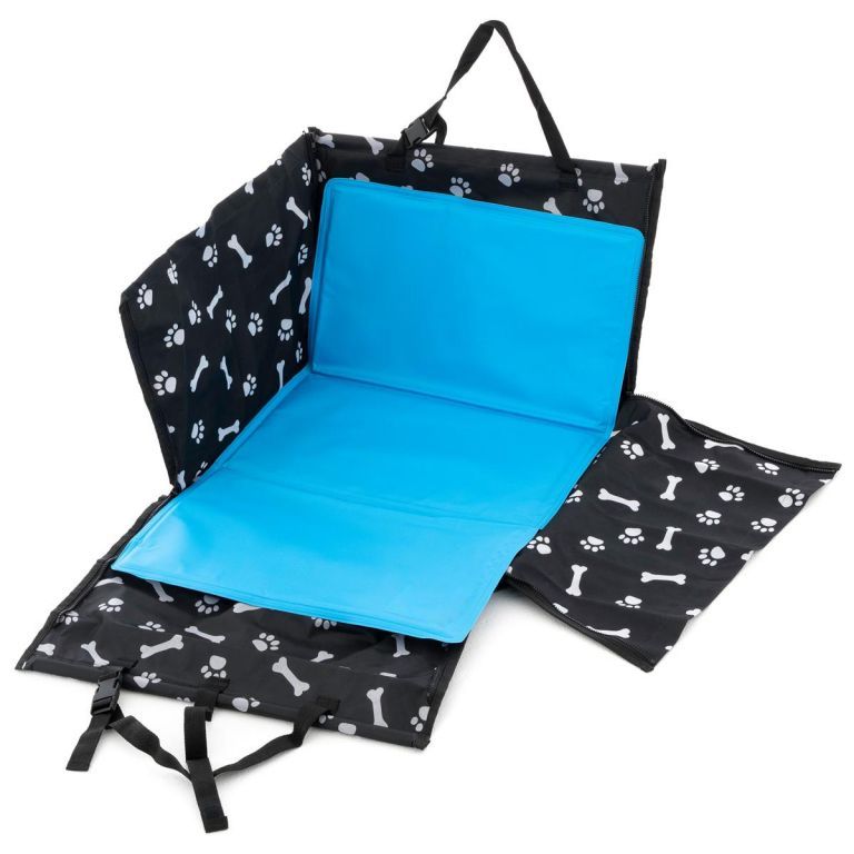 Tašku do auta lze použít mnoha způsoby, ať už jako ochranu proti zvířecím chlupům a nečistotám, nebo jako chladící tašku do kufru vozu na potraviny nebo nápoje. Díky postranním zipům lze z tašky ve chvíli vytvořit polstrovaný potah pro pohodlný odpočinek. Upevňovací pásky lze v autě připevnit dle potřeby a protiskluzový potaz zajistí lepší stabilitu tašky a zajistila tak bezpečné místo Vašim mazlíčkům. Účinek chlazení podložky, která je též v sadě obsažena, funguje po dobu několika hodin bez dalších potřebných zdrojů a lze ji použít do pelíšku nebo psí boudy. Chladící podložka absorbuje tělesné teplo a odvádí ho zpět do vzduchu. Díky všestrannému využití ji můžete použít jako podložku pod notebook. Podložka je vodotěsná a k údržbě postačí pouze vlhký hadřík a saponát.