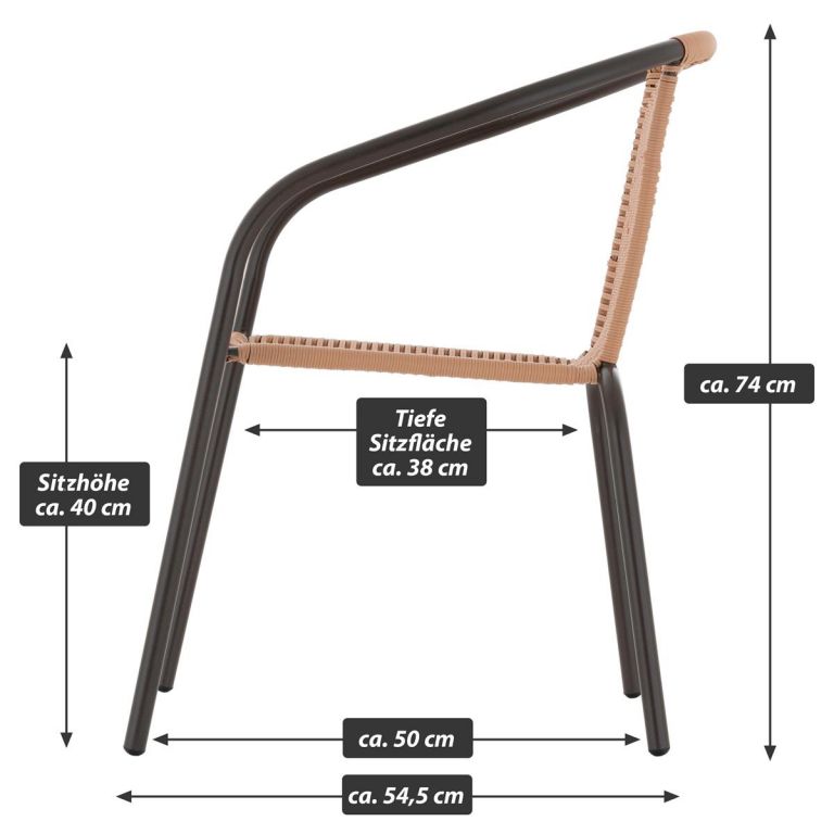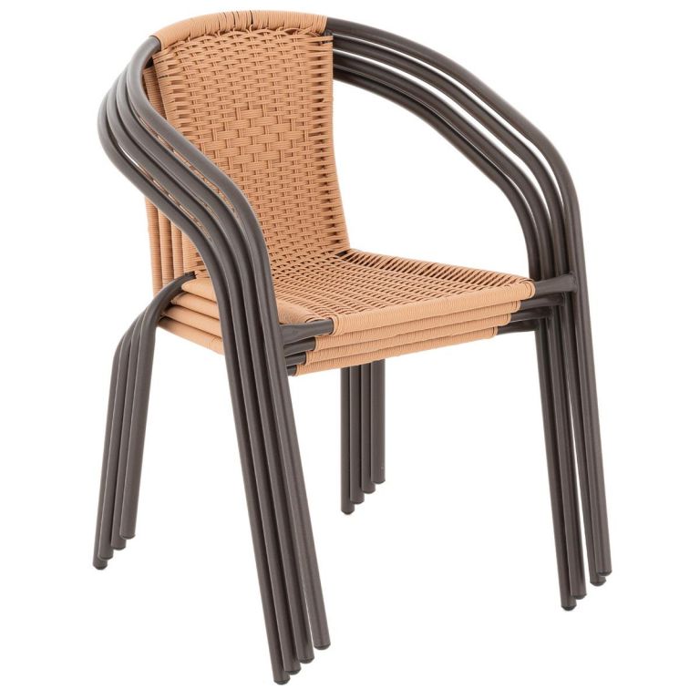 Čtyři bistro židle pro pravou středomořskou atmosféru u vás doma. Pokud chcete soupravu židlí odložit a uskladnit na zimní měsíce, můžete několik židlí tohoto stylu naskládat na sebe a ušetřit tak spoustu místa. Nohy židle jsou opatřeny gumovými krytkami. Zabraňují uklouznutí, tlumí hluk při pohybu a jsou šetrné k podlaze. Rám je vyroben z práškově lakované oceli s kladívkovou povrchovou úpravou. Polyratan je vyroben z plastu, je odolný proti roztržení a zajímavě tkaný.