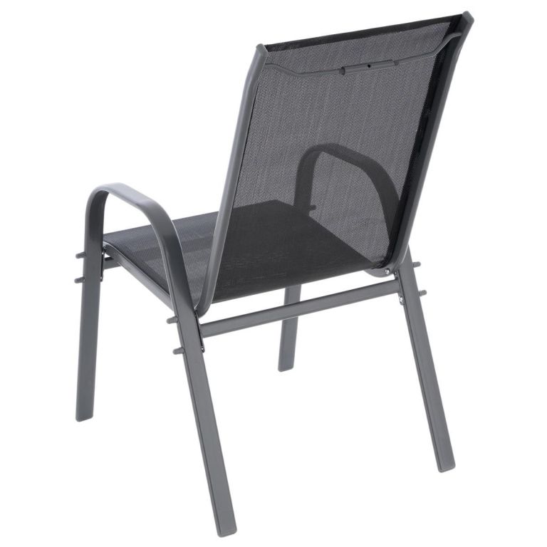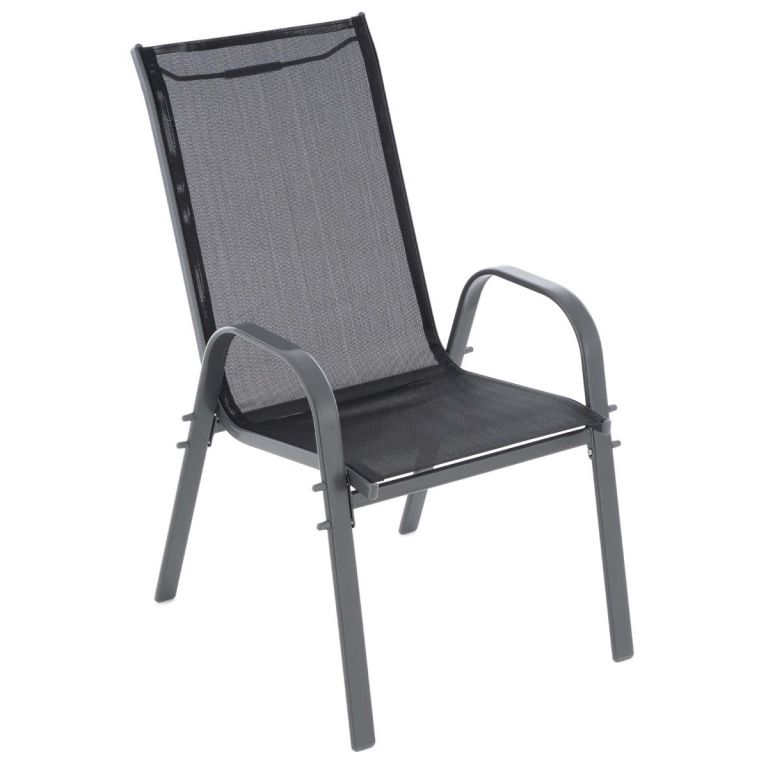 Křeslo je vybaveno područkami a vysokým opěradlem pro pohodlné sezení. Konstrukce je vyrobena z dvojitého ocelového rámu s práškovým nástřikem, sedák je potažen černou elastickou textilií. Materiály použité na této židli jsou bezúdržbové, odolné vůči povětrnostním vlivům a nevyžadují žádné speciální čistící prostředky. Toto křeslo je ideální pro vnitřní i venkovní použití. Židle je dodávána částečně rozložena a lze ji snadno stohovat na sebe, díky tomu šetříte místo