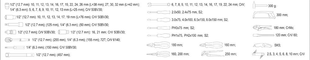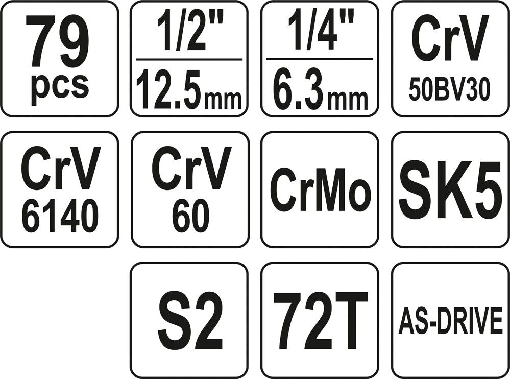 Gola sada 1/2", 1/4" obsahuje 79ks: nástavců, prodlužovacích nástavců, ráčny s plastovou rukojetí, kloubové nástavce očkoploché klíče, kleště, kladivo a další příslušenství. Vyrobené z kvalitní chromvanadiové a chrommolybdenové oceli CrV6140, CrV50BV30, CrV60, CrMo a S2 s funkcí AS-DRIVE. Funkce AS-DRIVE umožňuje vyvinout větší kontaktní sílu, neboť ke kontaktu se šroubem nedochází na hranách šestihranu, nýbrž v první třetině styčných ploch. Tím nedochází k poničení hlavice šroubu. Ořech mnohdy povolí i matice a šrouby již poničené. Ráčny jsou opatřeny 72 zubým mechanismem pro hladký chod. Sada je přehledně uložena v plastovém kufříku.