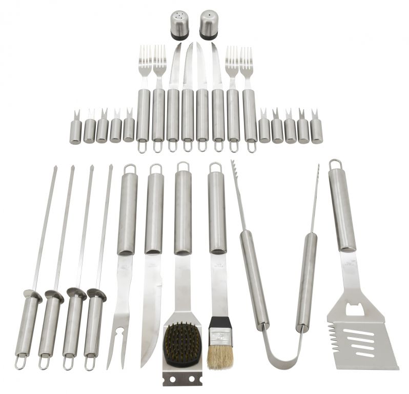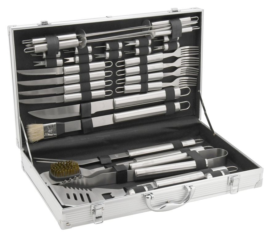 Profesionální sada grilovacího nářadí, se vším, co pro grilování potřebujete. Sada obsahuje veškeré nástroje pro přípravu a konzumaci nejrůznějších pokrmů, ale i následnou údržbu grilu. Veškeré nástroje jsou navíc kvalitně zpracovány z nerezové oceli. Sada je úhledně umístěna v transportním kufru a hodí se pro ty nejnáročnější vyznavače dobrého jídla. Výčet jednotlivých nástrojů ocení kdokoliv. Sada je primárně určena k využití doma na zahradě, ovšem užitečná je i na cestách.