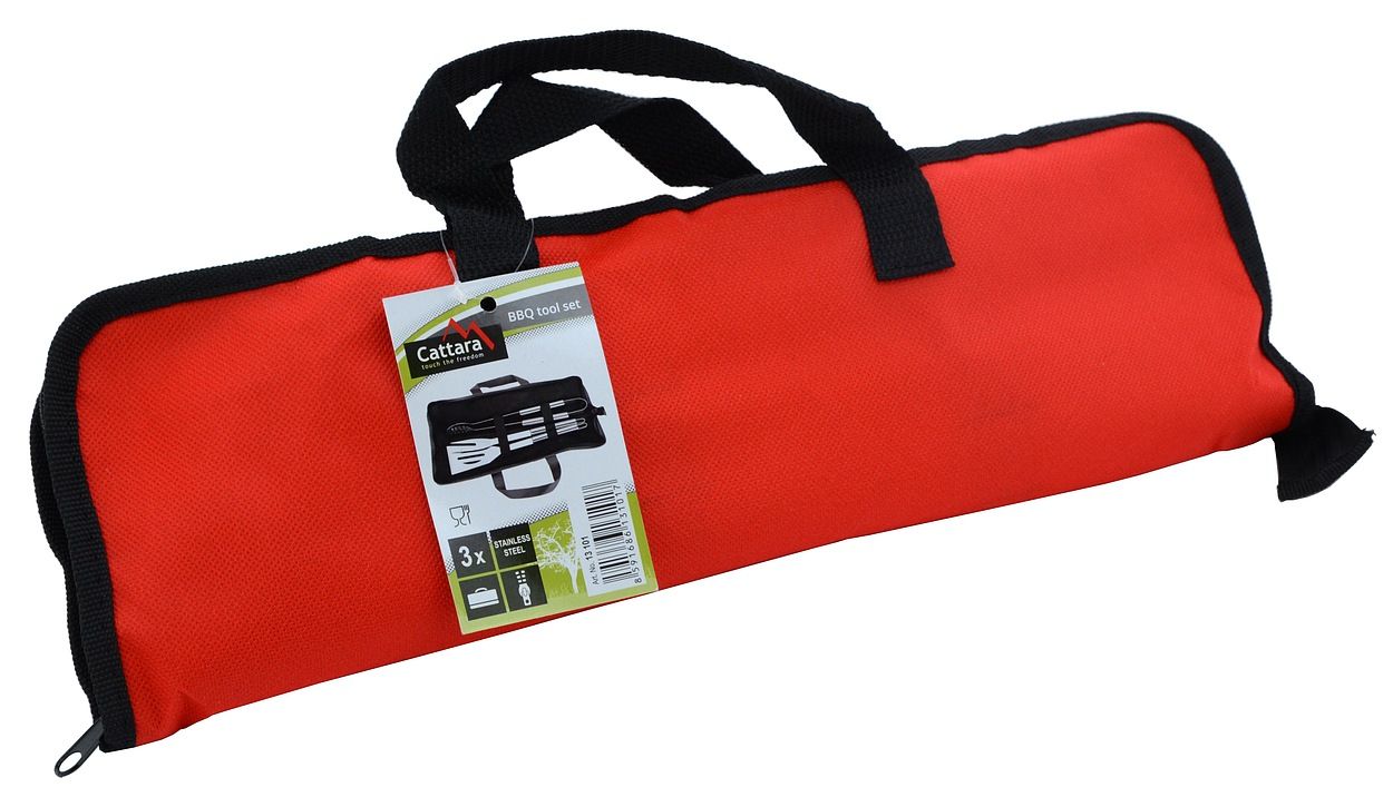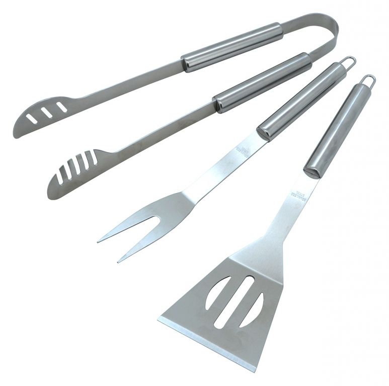 Sada nářadí pro grilování, skládající se z obracečky, vidličky a kleští. Kleště jsou speciálně tvarovány pro jistý úchop nejrůznějších pokrmů a mají délku 35 cm. Dvouzubá vidlička s délkou 32 cm. Obracečka délky 33 cm s precizně zabroušenou hranou, a odtokovými otvory pro otáčení masitých ale i jiných pokrmů. Jednotlivé nářadí je kvalitně zhotoveno z nerezové oceli, není nijak zbytečně tvarováno, což významně usnadňuje čištění. Rukojeti jednotlivých nástrojů jsou kruhového průřezu a výborně padnou do ruky. Všechny nástroje lze navíc zavěsit na háček. Celá sada je úhledně umístěna v transportní tašce malých rozměrů, se zapínáním na zip. Sadu tak využijete jak doma na zahradě, tak i na cestách.