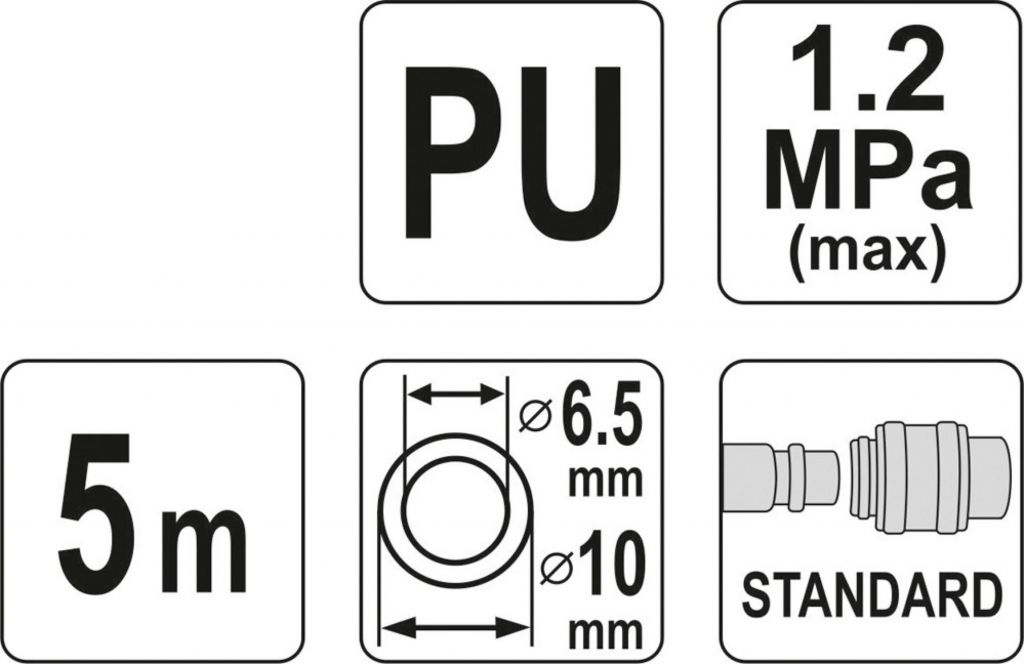 Profesionální spirálová vzduchová hadice s délkou 5 m zakončená rychlospojkami.