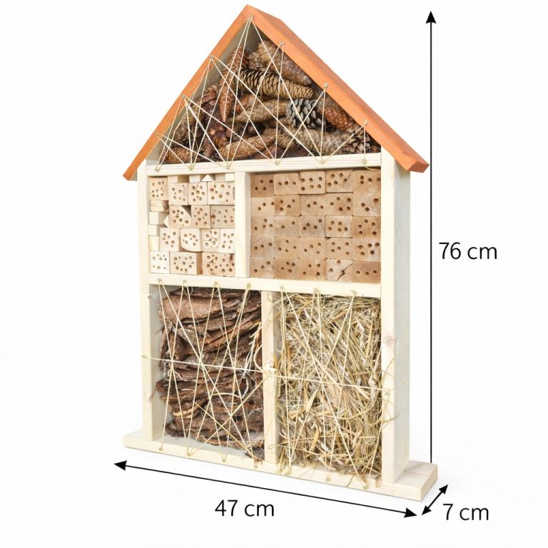 Hotel má rozměr 47 × 76 cm a tloušťku 7 cm, takže nabídne více typů komůrek pro různé druhy hmyzu. Doporučené umístění je výš nad zemí, ideálně na zeď nebo strom, na slunné (jižní) straně chráněné před deštěm a větrem. Domek je dodávaný složený, stačí ho jen umístit. Pro větší plochu zahrady je vhodné rozmístit více hotelů, aby měl hmyz více „stanovišť".