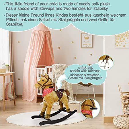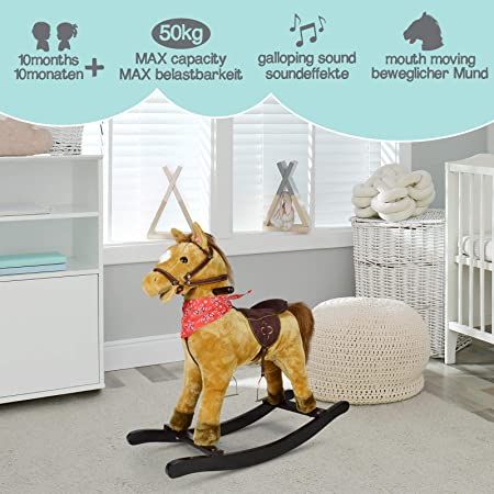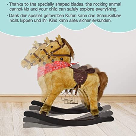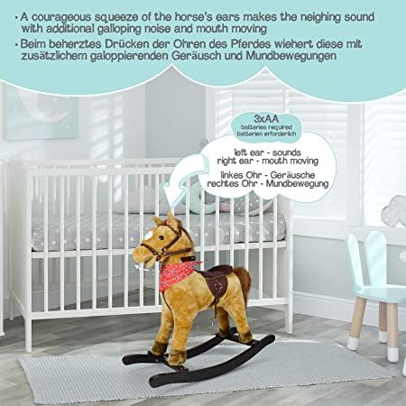 S tímto houpacím koněm zabavíte svou ratolest na několik hodin. Hračka je vyrobena z robustního dřeva, díky tomu Vám zaručí dlouhou životnost. Pro opravdu bezpečné držení jsou na hračce umístěny snadno použitelné rukojeti. Vaše dítě bude určitě také mile přakvapené zvukovými efekty, které hračka vydává. Při hraní bude kůň vydávat řehtavé zvuky a zvuky cvalu. Upozornění: Nevhodné pro děti do 10 měsíců. Pouze pro domácí použití. Používejte pod přímým dohledem dospělých.