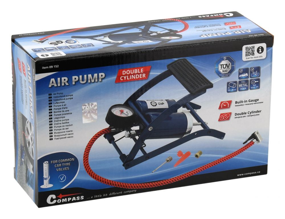 Klasická hustilka osazená dvěma písty. Kovová nožní hustilka se dvěma písty, určená pro huštění pneumatik osobních automobilů. Součástí balení jsou adaptéry pro různé použití.