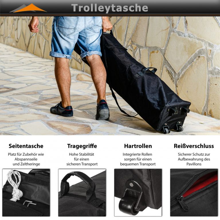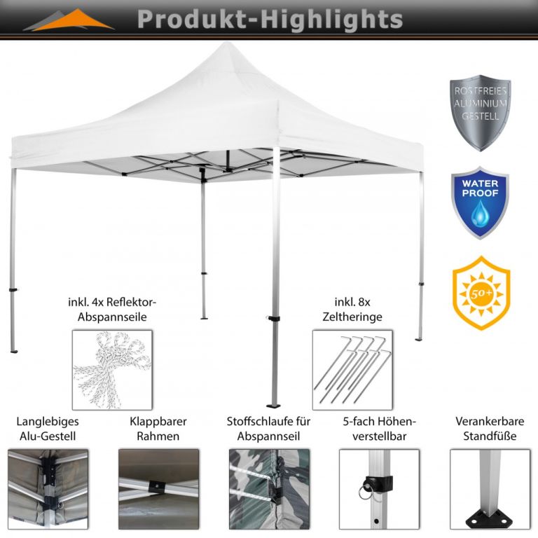 Skládací stan je vysoce kvalitně zpracován. Stan je 100 % funkční - je totiž vodotěsný a díky speciálně impregnované střešní krytině blokuje až 98 % UV slunečního záření. Nerezový rám poskytuje ochranu vůči poškrábání a korozi. Pro další stabilitu