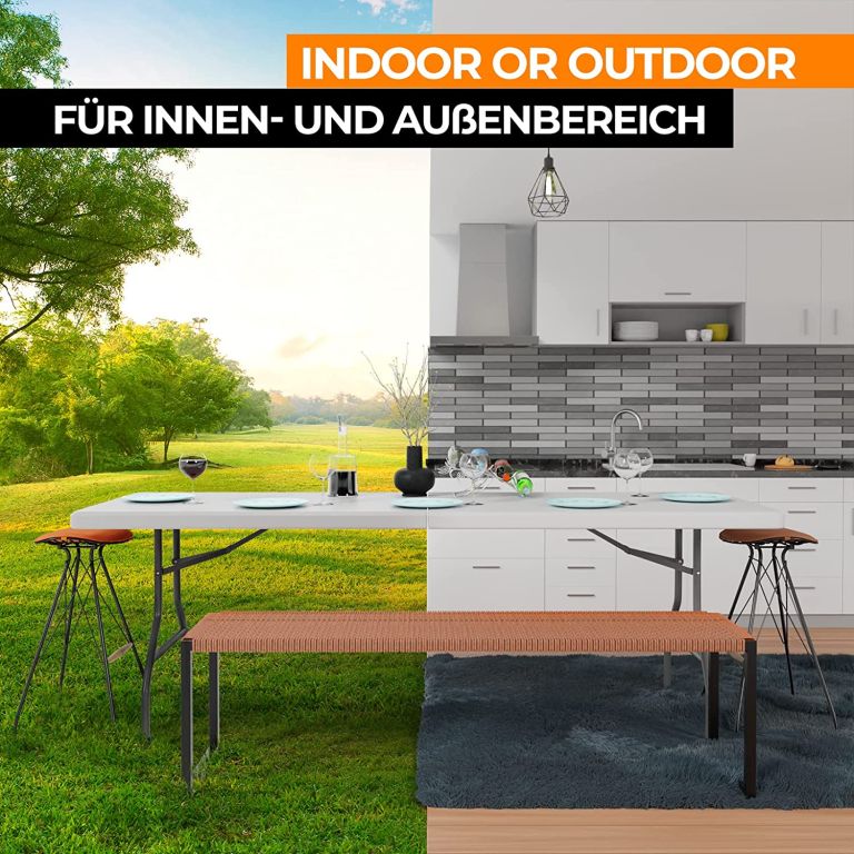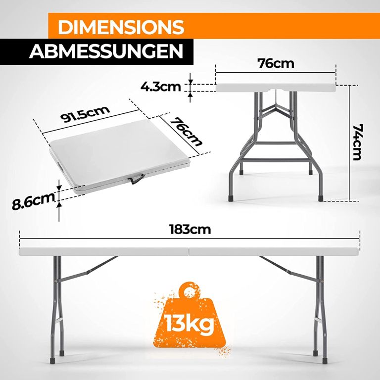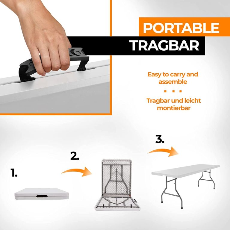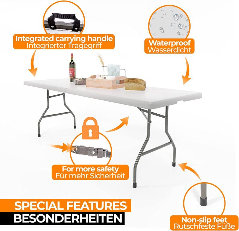 Tento všestranný skládací stůl je ideální pro zahradní párty s přáteli, rodinnou večeři i narozeniny dětí. Díky své velikosti lze bufetový stůl používat venku i uvnitř. Stůl lze snadno složit, takže jej lze snadno skladovat a přepravovat díky integrované rukojeti a nízké hmotnosti. Stabilitu zajišťují robustní nohy s gumovými krytkami. Robustní ocelové nohy a deska stolu z HDPE plastu odolná proti poškrábání s maximální nosností 150 kg dělají z tohoto stolu odolný kus nábytku.