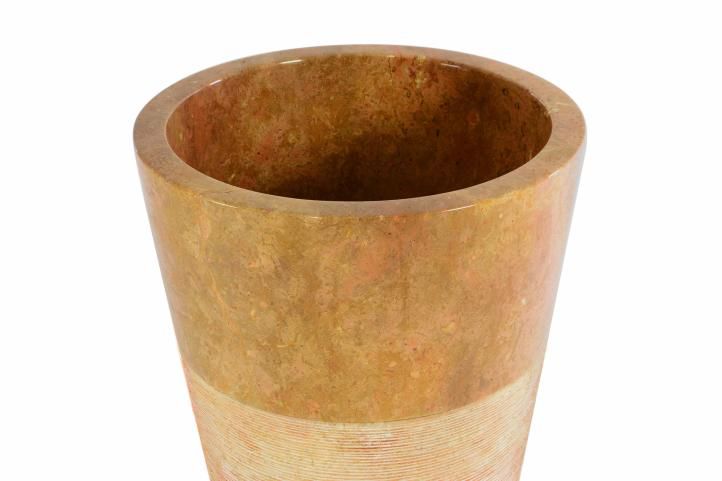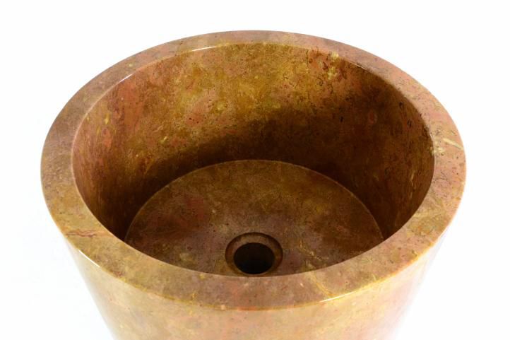 Exkluzivní samostojné umyvadlo vyrobené z přírodního mramoru v netradičním designu. Umyvadlo se stane chloubou a skvostem Vaší koupelny! Umyvadlo je vhodné do klasické koupelny, ale uvítáte ho také do koupelny pro hosty, vzhledem k jeho kompaktnosti. Umyvadlo je dvoudílné a skládá se z podstavce a samotného umyvadla. Vysoká kvalita mramoru a jeho zpracování dodá Vaší koupelně nádech luxusní elegance. Umyvadlo je vhodné také pro menší koupelny, kde je problém umysťovat koupelnový nábytek. Každé umyvadlo je jedičné a ručně vyráběné, horní část je zevnitř leštěná a noha je jemně drážkovaná. Na zadní straně umyvadla je otvor pro připojení odtoku, odtok ani baterie nejsou součástí balení. Upozornění! Umyvadla jsou originální, proto se každý kus může lišit rozměry, odstínem barvy i rýhováním kamene. Toto berte jako výhodu - nikdo další již nebude mít stejné umyvadlo jako máte Vy! Umyvadlo nelze vybrat z fotografie u produktu. Jedná se o ilustrativní fotografie, jak některá umyvadla vypadají, nemůžeme zaručit, jaké zrovna Vy dostanete. Vzhledem k uskladnění a balení není možné všechny krabice otevírat a vybírat konkrétní umyvadlo. Děkujeme za pochopení. Během čištění umyvadla vezměte prosím v úvahu, že se jedná o přírodní kámen a není možné na něj používat agresivní čistící prostředky. Používejte pouze přípravky, které nepoškozují nebo nenarušují povrch. Stojná noha by se ale měla trochu zapustit do podlahy k zajištění stability umyvadla. Kamenná umyvadla nejsou mrazuvzdorné, proto je nedoporučujeme mít přes zimní měsíce ve venkovních prostorách.