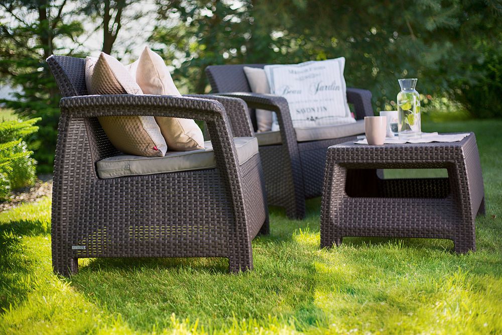 Souprava Corfu WEEKEND je menší moderní posezení jak ven, tak do interiéru. Souprava je vyrobena z lisovaného plastu v imitaci plochého ratanu. Set je doplněn o podušky, které zajistí ještě větší pohodlí. Jedná se o velmi oblíbenou soupravu. Skládá se ze dvou křesílek a stolku. Jednoduchá montáž i údržba.